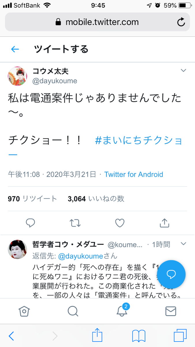 ホーム > ネタ・おもしろ > 【画像あり】最新のコウメ太夫のツイートわろたwwwwwwww 2020/03/22 1: 以下、名無しにかわりましてネギ速がお送りします 2020/03/22(日) 09:46:45 ID:eT2S3/fr0.net 2: 以下、名無しにかわりましてネギ速がお送りします 2020/03/22(日) 09:47:26 ID:W6/cj8cvM.net 社会的なネタのほうが合うな 4: 以下、名無しにかわりましてネギ速がお送りします 2020/03/22(日) 09:48:35 ID:nctZ9EagM.net マジで初めて小梅太夫で正面から笑った 続きを読む - ネタ・おもしろ