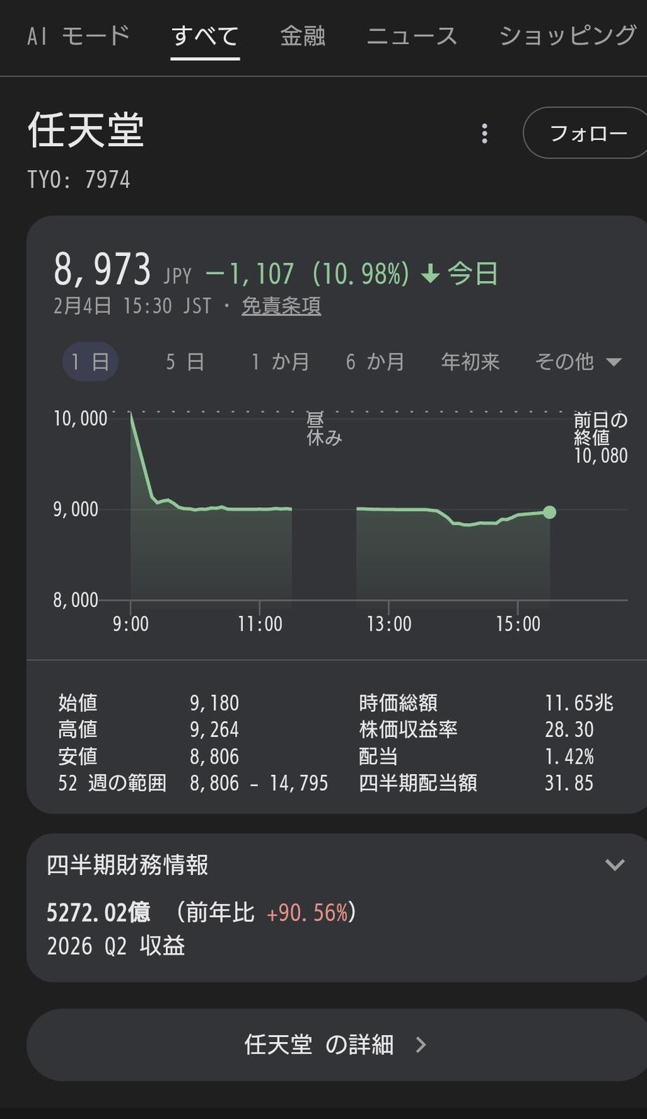ホーム > 画像ネタ > 【画像】任天堂の株価、ヤバすぎる 2026/02/05 1: 以下、名無しにかわりましてネギ速がお送りします 2026/02/04(水) 17:55:24.50 ID:yUSuWZeo0 ひえ… 2: 以下、名無しにかわりましてネギ速がお送りします 2026/02/04(水) 17:56:04.15 ID:sqCiuPd20 分割したとき6000円台やったしいうほどヤバないやろ 3: 以下、名無しにかわりましてネギ速がお送りします 2026/02/04(水) 17:56:38.95 ID:5s080hEQ0 今買い時? てか任天堂って株主優待何貰えるんや 続きを読む - 画像ネタ