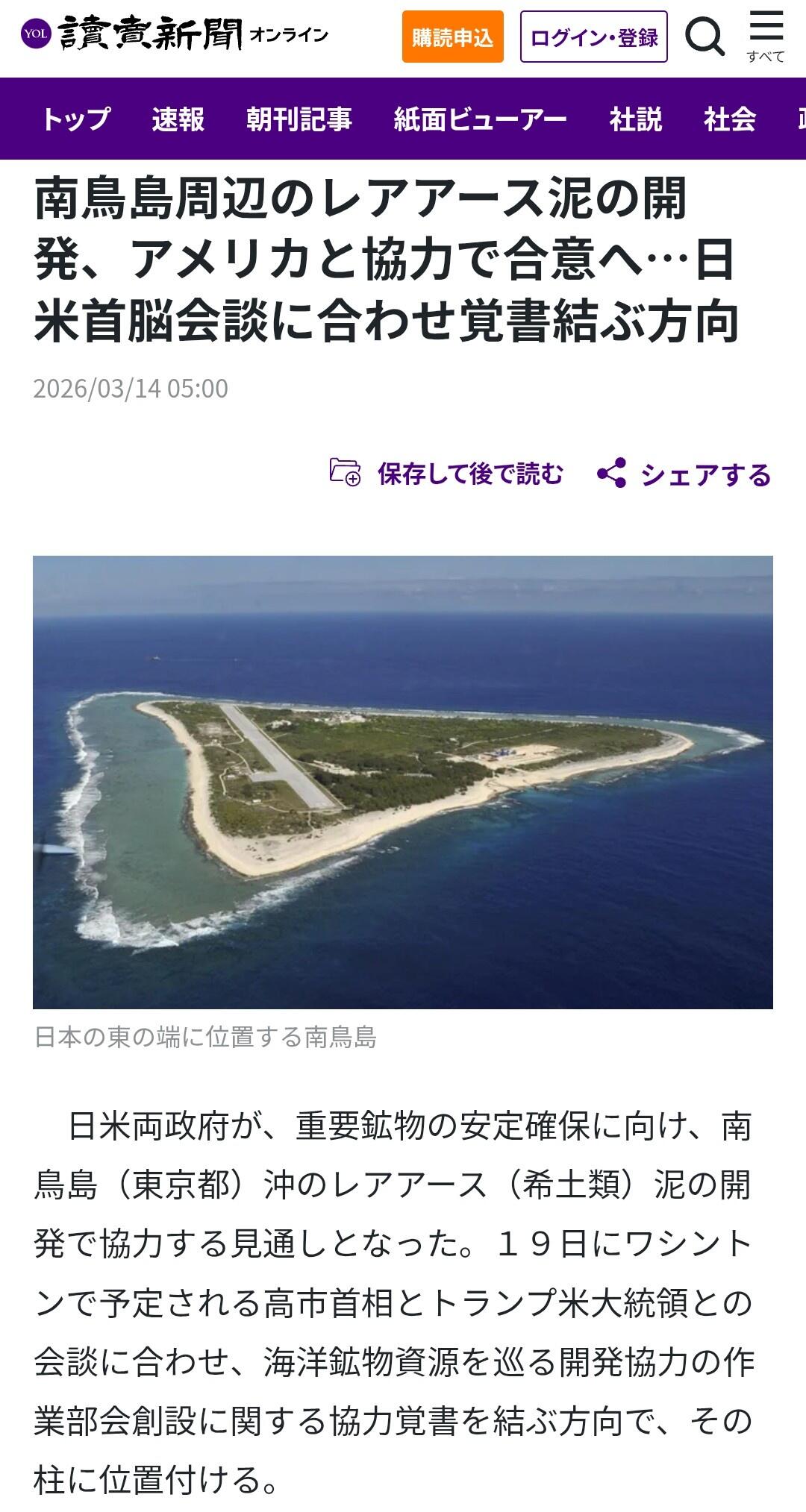 ホーム > 画像ネタ > 【画像】南鳥島のレアアース開発、日本の作品無断使用のアメリカ政府と協力で合意する 2026/03/15 1: 以下、名無しにかわりましてネギ速がお送りします 2026/03/14(土) 08:29:03.39 ID:K6lnOp0h0 2: 以下、名無しにかわりましてネギ速がお送りします 2026/03/14(土) 08:29:39.90 ID:07IdFBg50 レアアースも無断で強奪しそう 3: 以下、名無しにかわりましてネギ速がお送りします 2026/03/14(土) 08:29:49.49 ID:u2G5Vy600 それはそれこれはこれでええやん 続きを読む - 画像ネタ