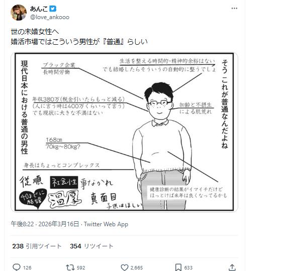 ホーム > 画像ネタ > 【画像】女性「婚活市場の普通の男がこれです」←女性が可哀想だと話題に 2026/03/20 1: 以下、名無しにかわりましてネギ速がお送りします 2026/03/18(水) 17:50:59.26 ID:So81USPa0 2: 以下、名無しにかわりましてネギ速がお送りします 2026/03/18(水) 17:51:07.84 ID:So81USPa0 やばい 3: 以下、名無しにかわりましてネギ速がお送りします 2026/03/18(水) 17:51:19.16 ID:So81USPa0 どうすんのこれ 続きを読む - 画像ネタ