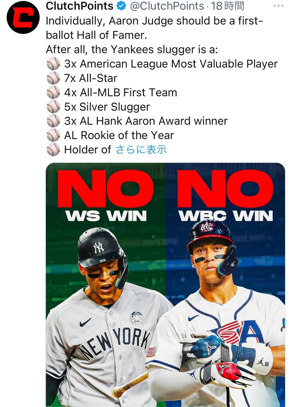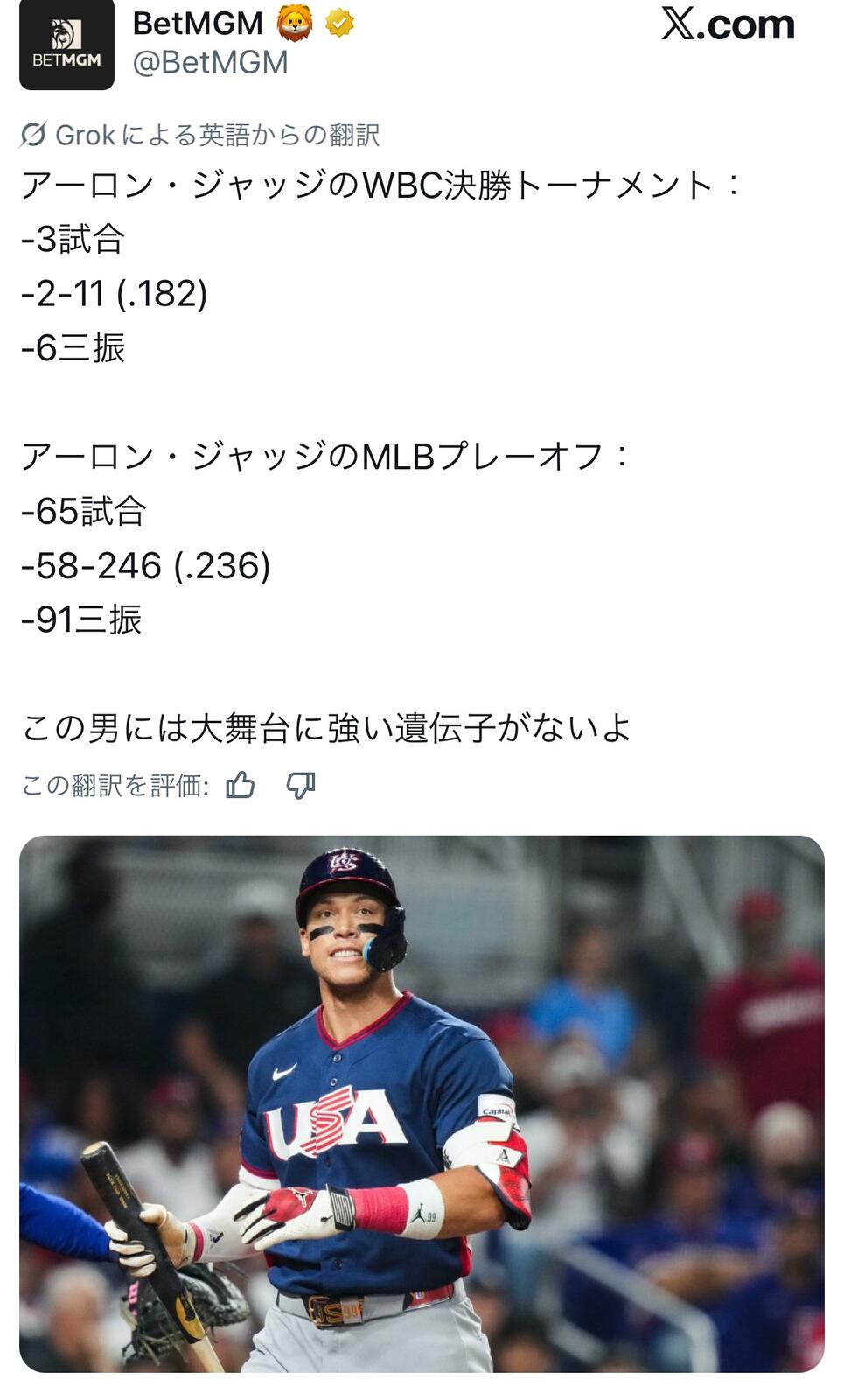 ホーム > 画像ネタ > 【画像】アーロン・ジャッジ、米国メディアから次々と叩かれ初めてしまう 2026/03/21 1: 以下、名無しにかわりましてネギ速がお送りします 2026/03/19(木) 18:21:32.51 ID:67P36FDQ0 2: 以下、名無しにかわりましてネギ速がお送りします 2026/03/19(木) 18:22:18.02 ID:67P36FDQ0 酷すぎる 4: 以下、名無しにかわりましてネギ速がお送りします 2026/03/19(木) 18:24:55.13 ID:H71I9EeQd 雑魚専だもん 続きを読む - 画像ネタ