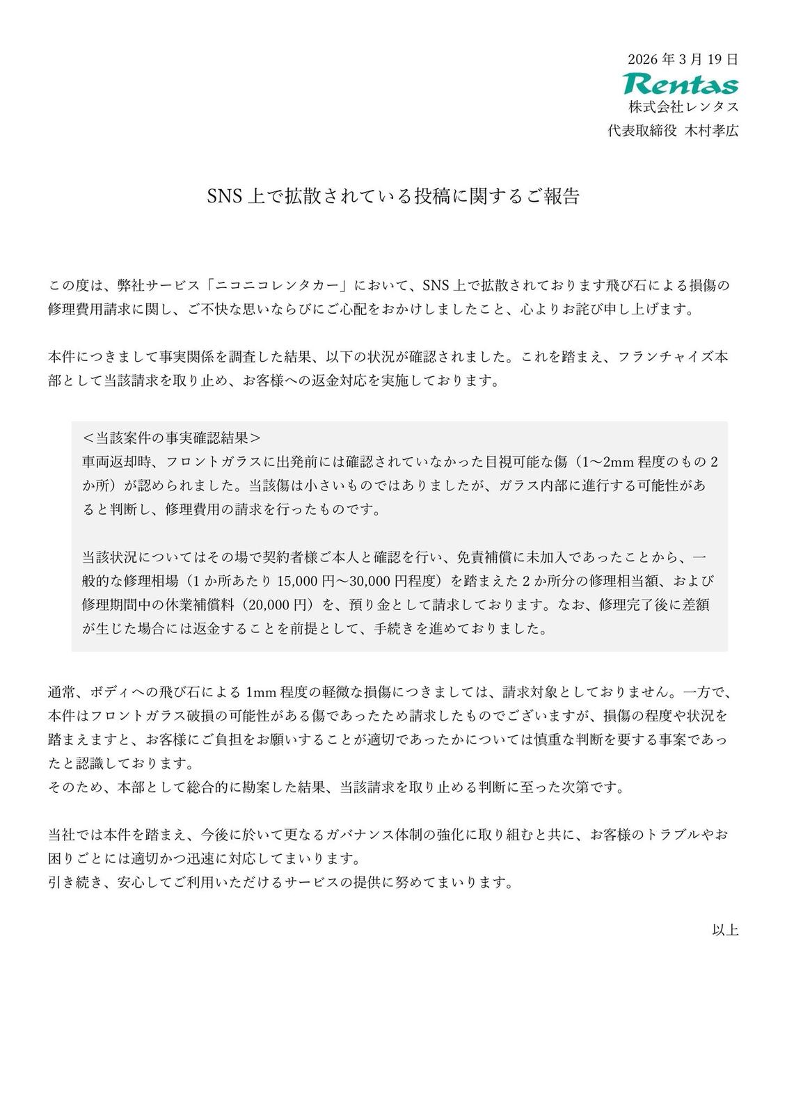 ホーム > 画像ネタ > 【画像】ニコニコレンタカー、飛び石による軽微な傷の修理代88,000円が妥当だと言い張ってしまう 2026/03/21 1: 以下、名無しにかわりましてネギ速がお送りします 2026/03/20(金) 02:13:24.18 ID:FlcZS0Nd0 2: 以下、名無しにかわりましてネギ速がお送りします 2026/03/20(金) 02:14:02.62 ID:FlcZS0Nd0 実際の傷 3: 以下、名無しにかわりましてネギ速がお送りします 2026/03/20(金) 02:14:32.36 ID:Mj5p7pnQ0 ニコニコレンタカー使ったことあるわ そんな酷い感じちゃうかったけどな 続きを読む - 画像ネタ