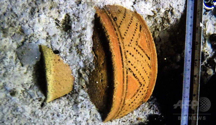 メキシコ南東部キンタナロー州の水中洞窟で見つかった器