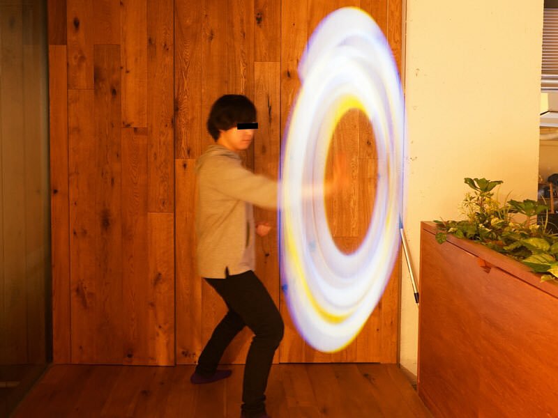 サイリウムをヒモで手首に結び、それを振り回しながら写真を撮ると『パンチの衝撃波』や『バリア』などをCGいらずで再現できることを発見しました