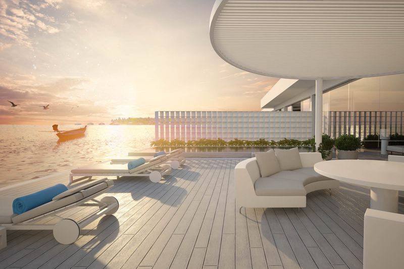海上の最上階にはベッドルーム2部屋に加え、海を眺めながら入れるバスタブや夕日を臨めるサンデッキ、インフィニティプールもある。別のリゾート施設から大きく離れており、海面下のバスルームも魚たちに見られていることを気にしなければ、プライバシー上の問題はない。