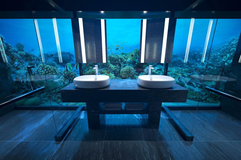 「世界の他のどんな場所でも味わえない経験を約束する」と設計したアハメド・サリーム氏は言う。透明なアクリルガラスの向こうを泳ぎ回る熱帯魚に囲まれながら過ごせる海面下のベッドルームなどというものは、確かに珍しい。