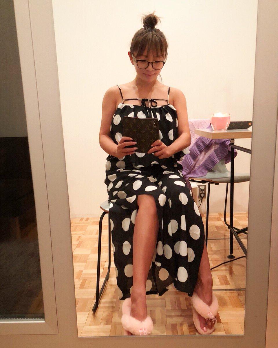2枚目の浜崎はくつろいだ様子で、髪はお団子アレンジでまとめている。
