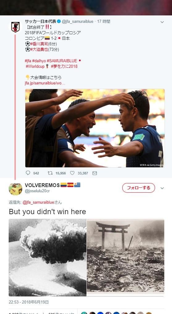 勝利を伝えた日本代表公式ツイッターの投稿に、あるコロンビアサポーターが、原爆を揶揄するようなリプライを送ったのだ。