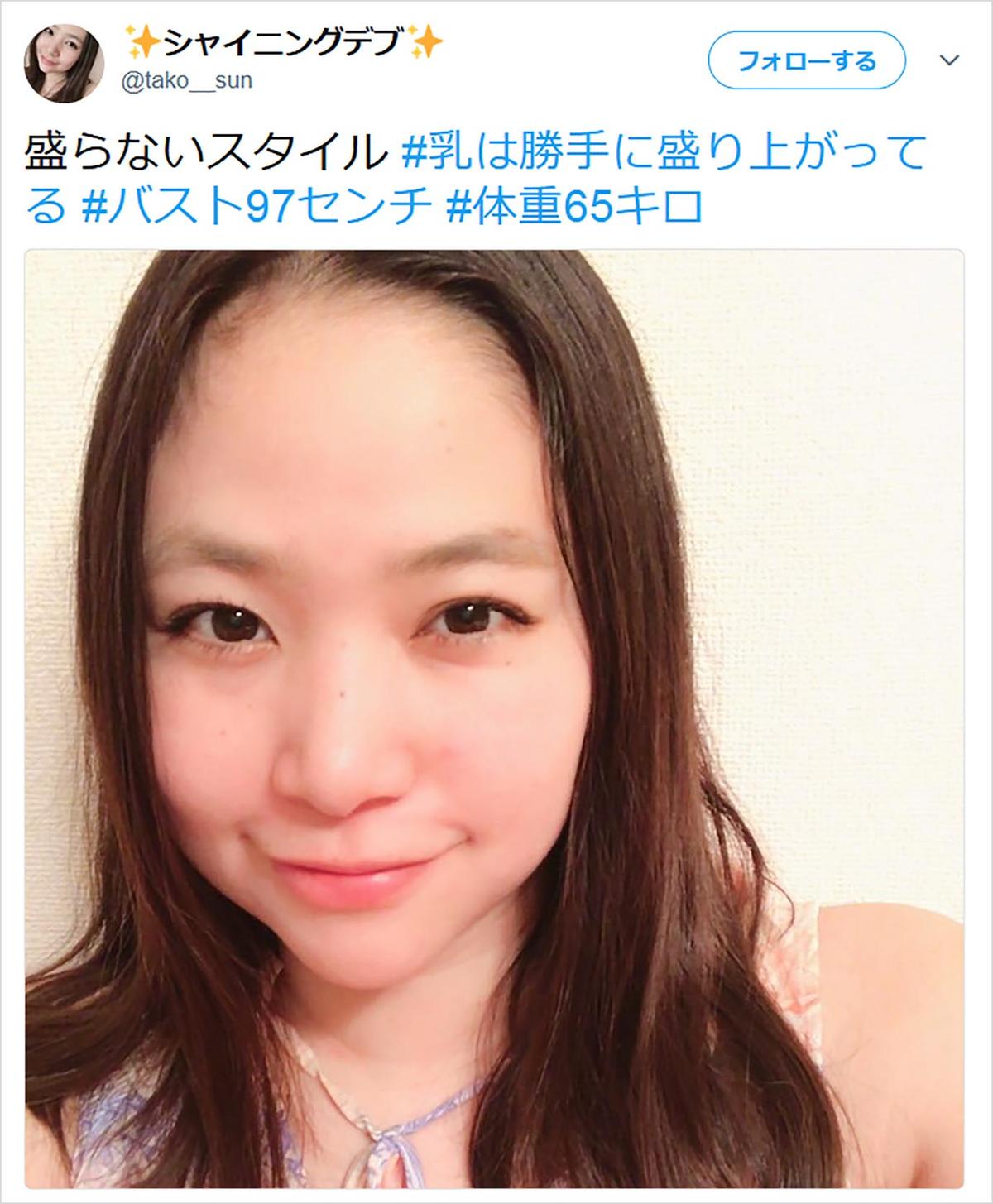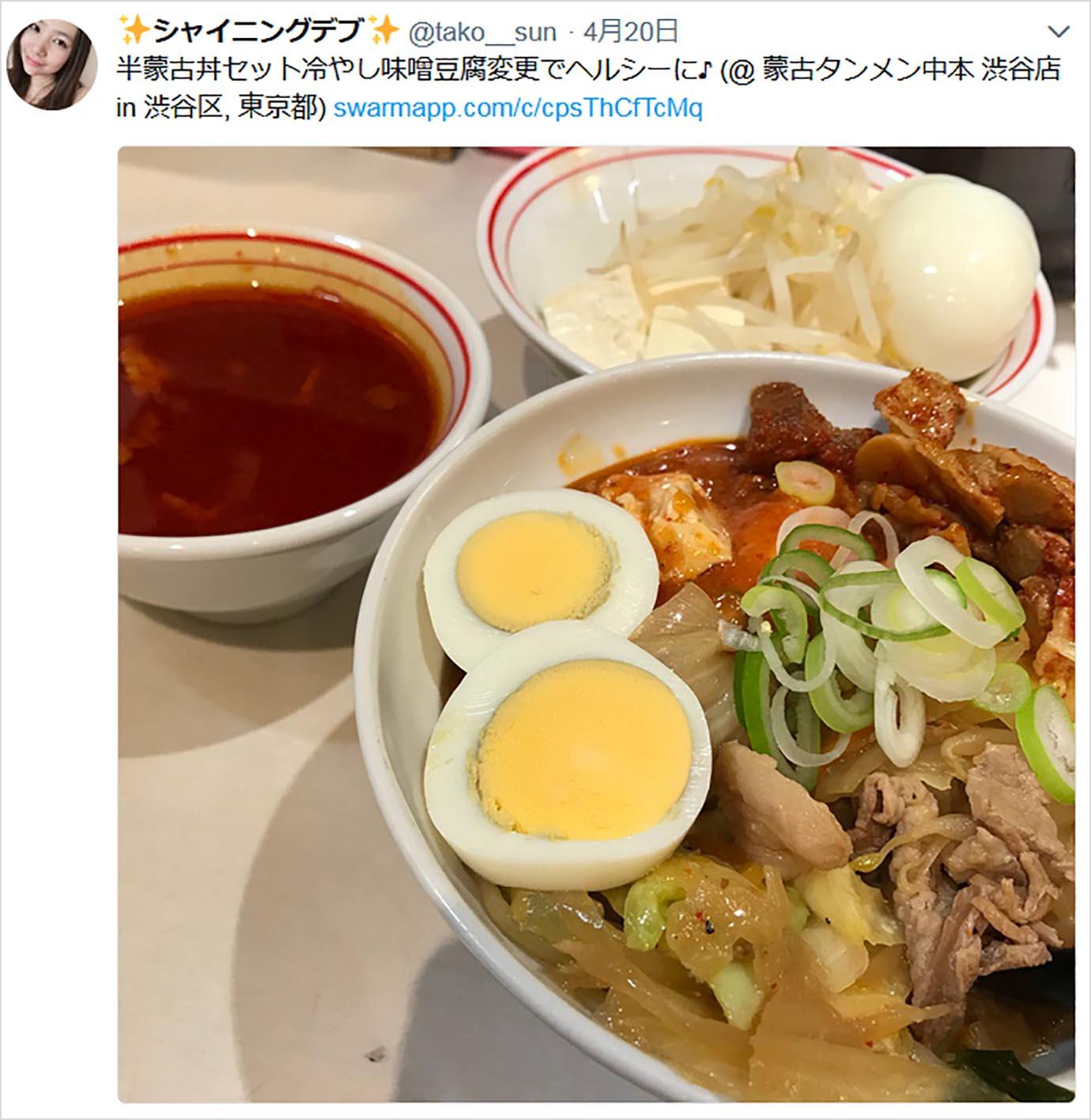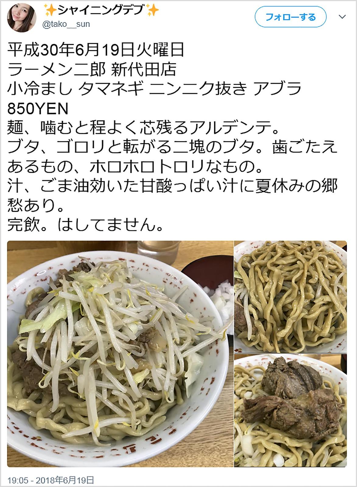 彼女は自身の公式Twitterにラーメン二郎で食べたラーメンの写真を掲載しつつ、さらに顔や肉体の写真を掲載し、話題となっているのだ。