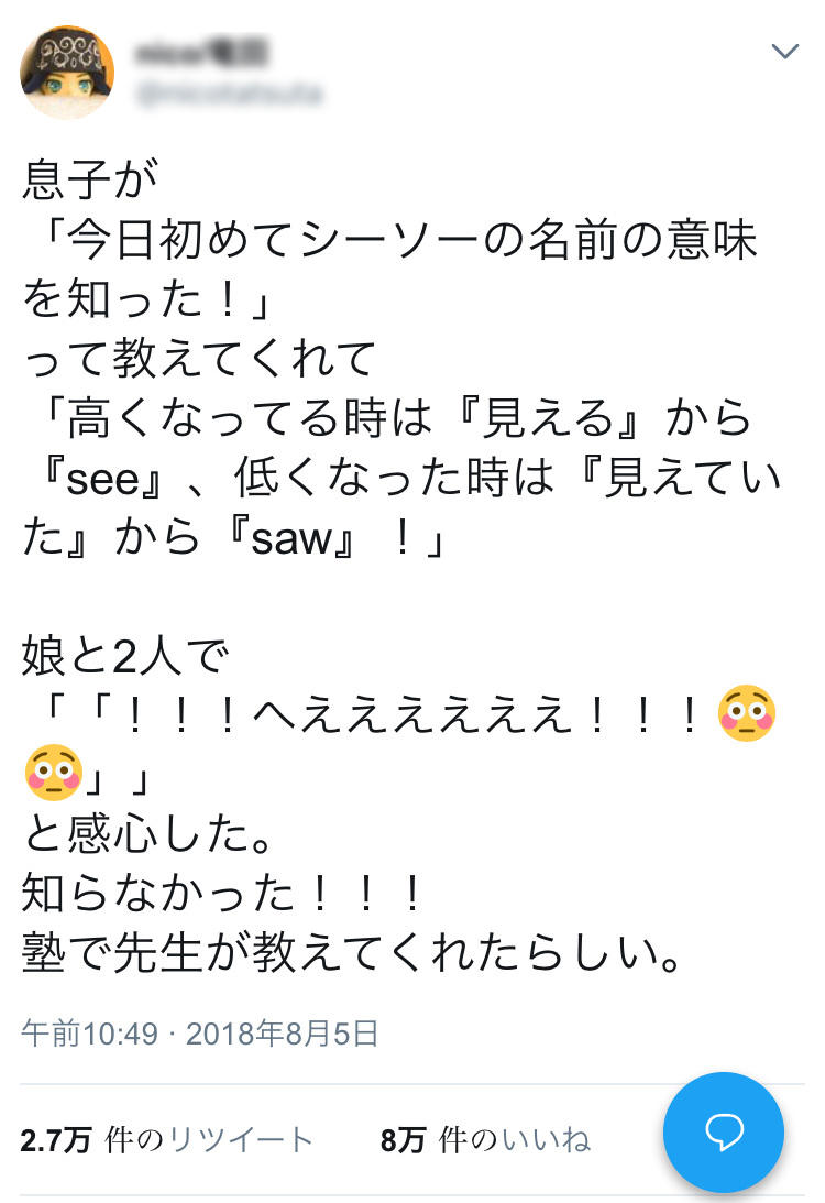 女さん「シーソーの語源は『see』の過去形なんだって!」→怒涛の8万いいねwwwwwwww