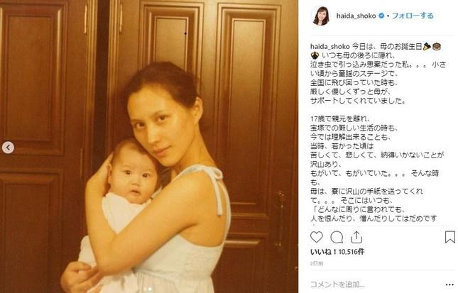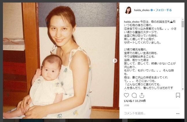タレントのはいだしょうこさん(39)が、赤ちゃんのときに母親の膝に乗っている写真をインスタグラムに投稿し、反響を呼んでいる。