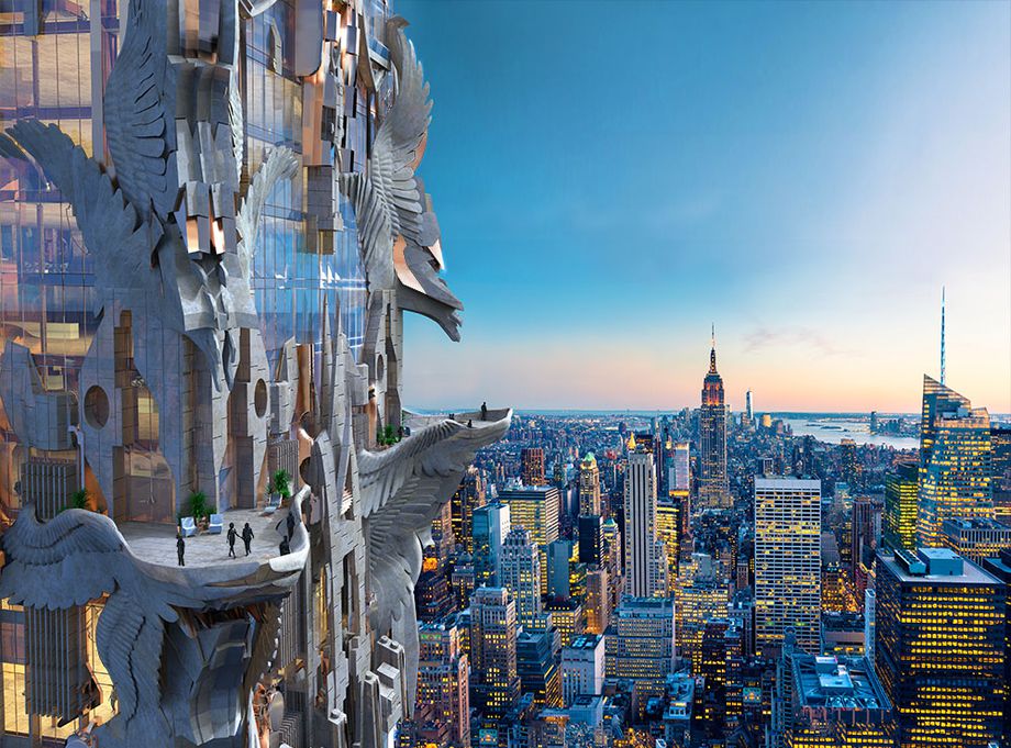Yet, with Gothic-inspired ornamentation made using robotic CNC technology, carved concrete wings that extend from the building, and four enormous cantilevered balconies overlooking the city, Gage’s proposal would certainly stand out.