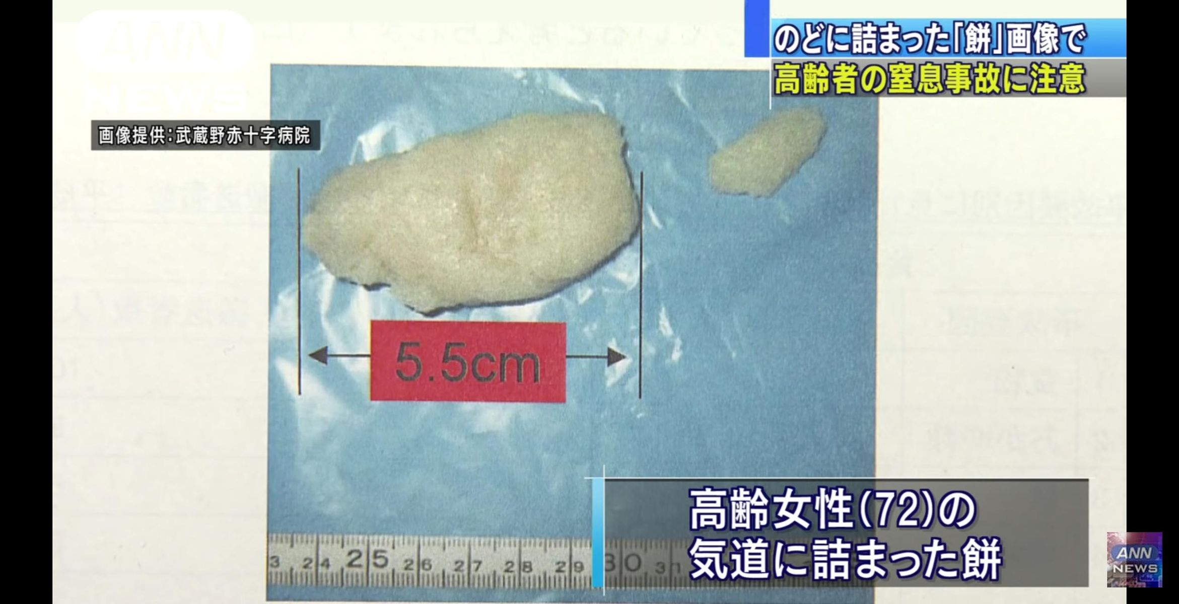 これは実際に窒息し、重症となった女性患者から摘出された餅の写真です。5.5センチの大きな塊で、ほとんど噛み砕かれていないことがわかります。