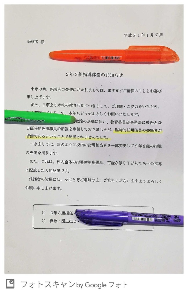 ホーム > 社会問題 > 教師が少なすぎて横浜市の義務教育崩壊寸前 2019/01/19 1: 義務教育のオワリ 2019/01/19(土) 10:42:18.33 0 退職した教師の穴埋めのため臨時教師を募集するが誰も来ないため授業ができない 病気で休職の教師の代わりが見つからず授業が受けられない事態 ↑の穴埋めが見つかったが在任期間が短すぎて成績がつけられない 続きを読む - 社会問題