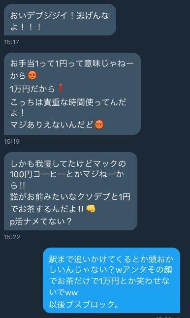 ホーム > 画像ネタ > 【画像あり】おっさん「パパ活女に1円玉渡して逃げたら発狂したwwwwwwww」 2019/02/18 1: 以下、名無しにかわりましてネギ速がお送りします 2019/02/16(土) 16:07:27.667 ID:9X7XK/0g0.net ゴルゴンゾーラまさお @***** さっきツイッターのパパ活の23の女の子とお茶してきたの。「お手当はお茶で1希望です。」って言ってたから1円玉机に置いてバイバイしたら 「1万円です!」って追いかけられたんだけど。電車乗ってなんとか逃げ切ったけど駅構内で「1万円!アタシの1万円!」叫んでてヤバかったw パパ活怖い・・・。 ゴルゴンゾーラまさお @***** 返信先: @*****さん そういえばメッセ続きあったんだった。 👀Rock54: Caution(BBR-MD5:1341adc37120578f18dba9451e6c8c3b) 3: 以下、名無しにかわりましてネギ速がお送りします 2019/02/16(土) 16:08:42.971 ID:OO/rziWE0.net ワロタ 続きを読む - 画像ネタ