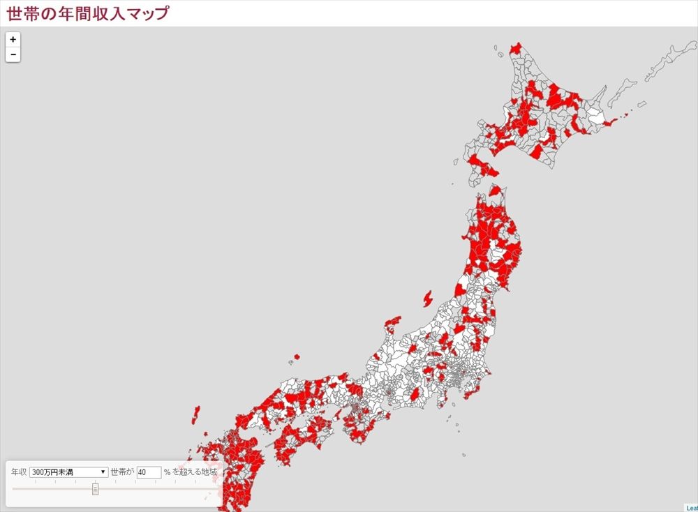 ホーム > 痛いニュース > 地方が貧乏すぎる件。こいつらどうやって生活してるんだ 2016/05/23 1: アイアンクロー(茨城県)@\(^o^)/ 2016/05/23(月) 17:06:18.19 ID:2WcyDZSg0 BE:509143435-PLT(12000) ポイント特典 転載元:http://hayabusa3.2ch.sc/test/read.cgi/news/1463990778/笑えるコピペ『神と人間の狭間(はざま)に居る者』http://blog.livedoor.jp/nwknews/archives/5028983.html ☆世帯の年間収入マップ http://shimz.me/datavis/mimanCity/ 赤色が世帯の40%で年収300万円以下のエリア 続きを読む - 痛いニュース