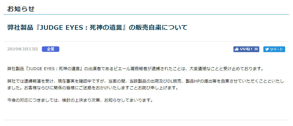 出演している作品セガのゲーム『JUDGE EYES:死神の遺言』が販売自粛となった。