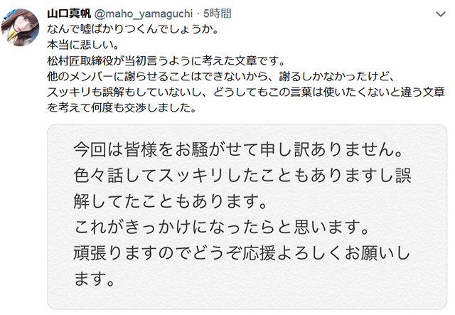 その後、山口がツイッターで松村氏が謝罪用に考えたと思われる文章も公開したものの、これについても否定。