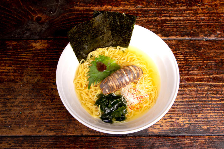 海をイメージし海苔やワカメをトッピング、オオグソクムシの殻・身・内臓を丸ごと味わえるラーメンです。