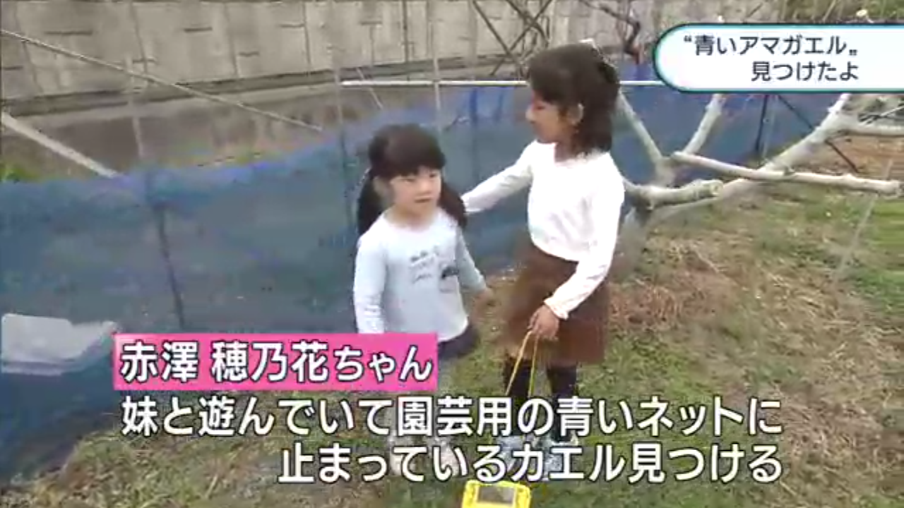 18日夕方、徳島市川内町の畑で、近くに住む小学2年生の赤澤穂乃花ちゃんが妹と遊んでいたところ、園芸用の青いネットに止まっているカエルを見つけました。