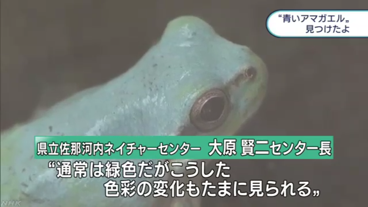 見つかったのは、体長3センチほどのアマガエルで、普通は緑色をしていますが、このアマガエルは全身がトルコ石のような淡い青色をしています。