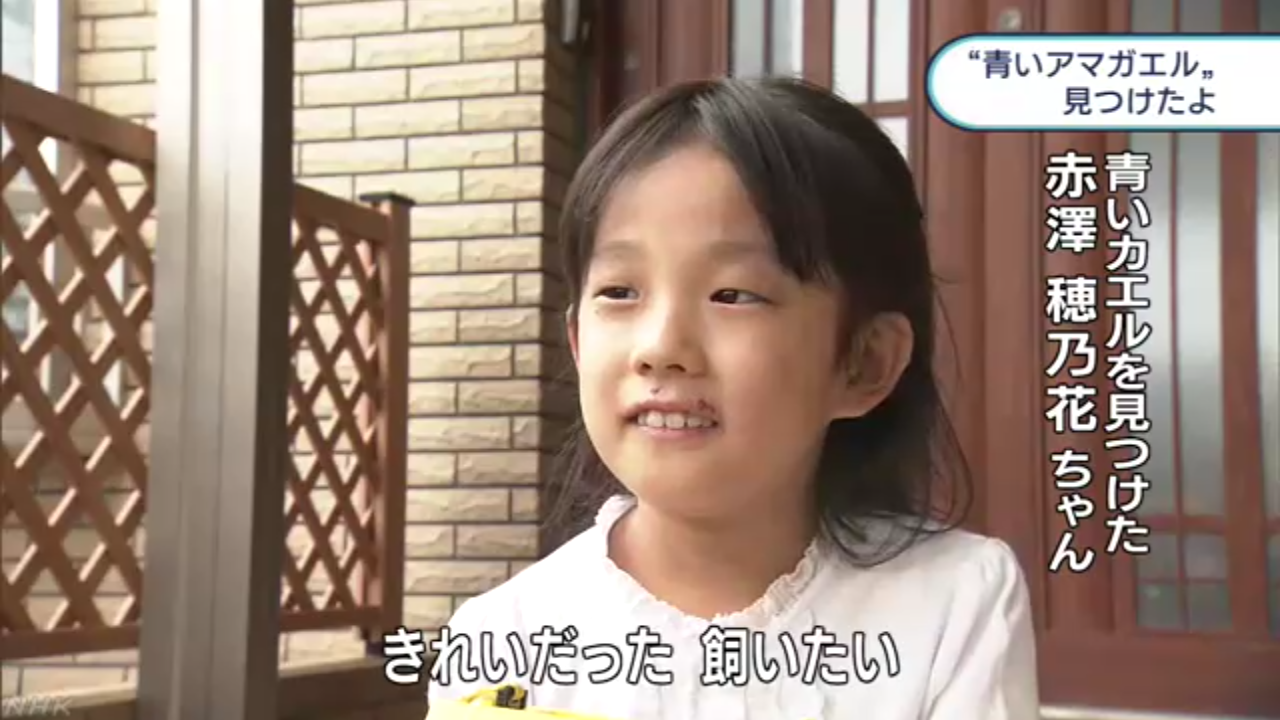 よく見ると、緑色ではなく青色をしていたことに驚いた穂乃花ちゃんは、祖母を呼んで捕まえてもらい、同時に捕まえた緑色をした普通の2匹と一緒に、今は自宅で飼育している