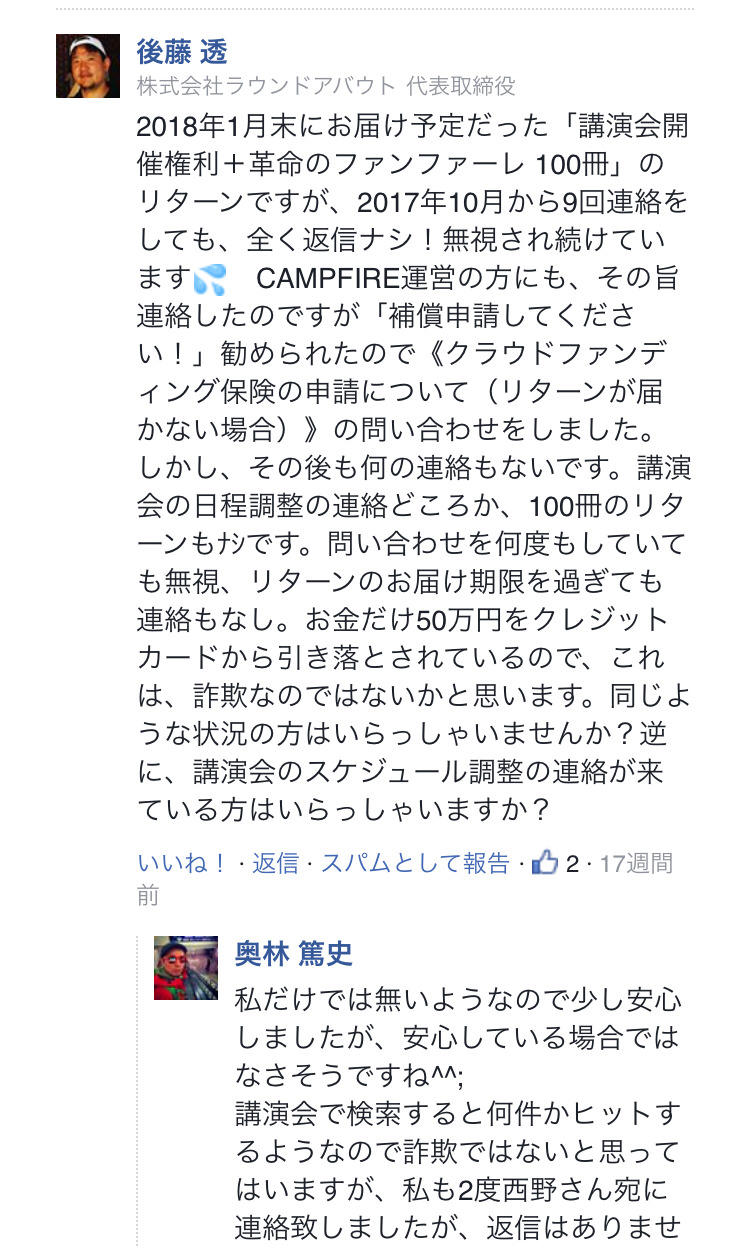 リターン(講演する権利)の連絡がまったく無く、出資者ブチギレ