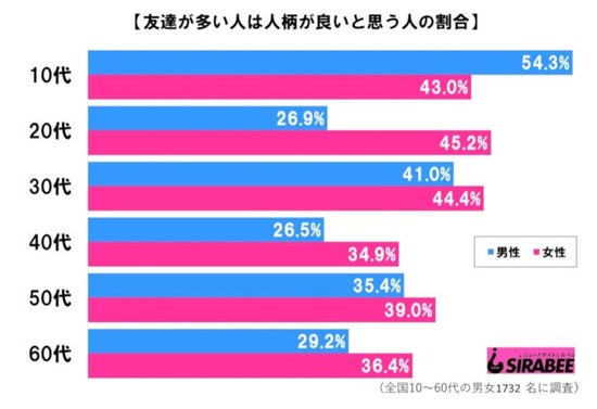 10代男性が54.3%と、突出して高い割合に。若い世代ほど、友達の多さと人柄の良さは比例しているという考えを持つ傾向にあるようだ。