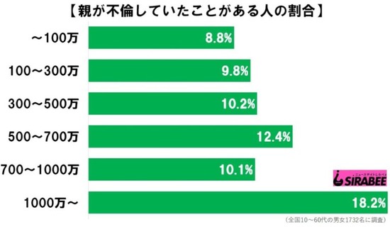 年収1000万以上は親の不倫経験が突出して高いことが判明した。自活できない歳で親の不倫を知った場合、家庭の崩壊を危惧し経済的な不安を抱える子供も多いようだ。