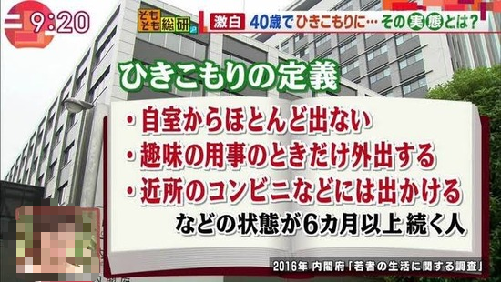 引きこもりの定義 → 「自室から殆ど出ないがコンビニ等には出かける状態が6ヶ月以上続く」