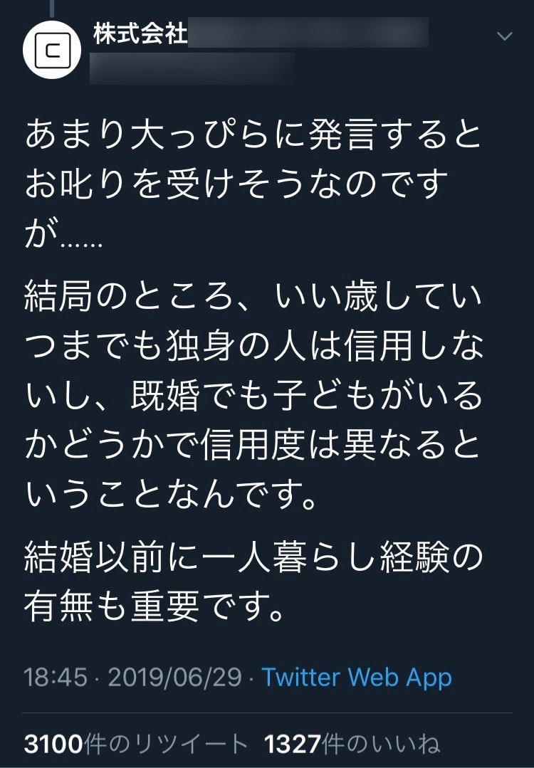ホーム > 祭り・炎上 > 【バカッター】企業「いい歳して独身は信用ないので給料安くしますwww」→炎上wwwwwwww 2019/07/03 1: 以下、名無しにかわりましてネギ速がお送りします 2019/07/01(月) 13:39:13.979 ID:J+p8vETz0.net 2: 以下、名無しにかわりましてネギ速がお送りします 2019/07/01(月) 13:40:23.248 ID:GJiqzfl/a.net 独身に親殺されでもしたんか? 3: 以下、名無しにかわりましてネギ速がお送りします 2019/07/01(月) 13:40:55.709 ID:MzFHMFy2x.net よしこれは全力で潰せ 続きを読む - 祭り・炎上