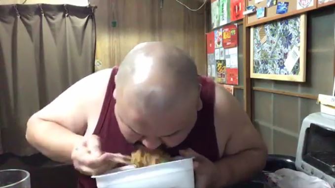 爆食王わったんという名前の大柄な男性は『ビッグブリッヂの死闘』をBGMに口に麺を入れていく入れていく。