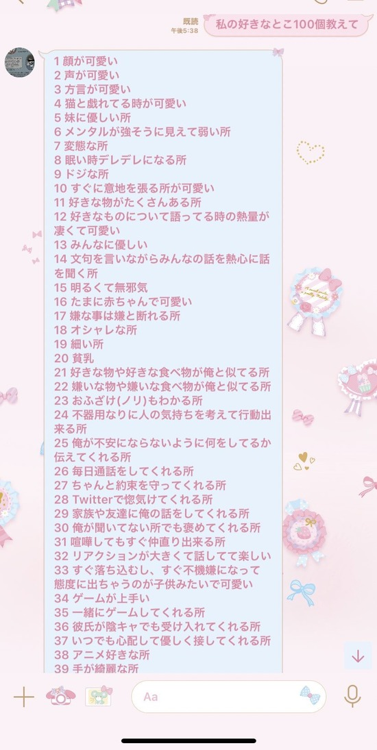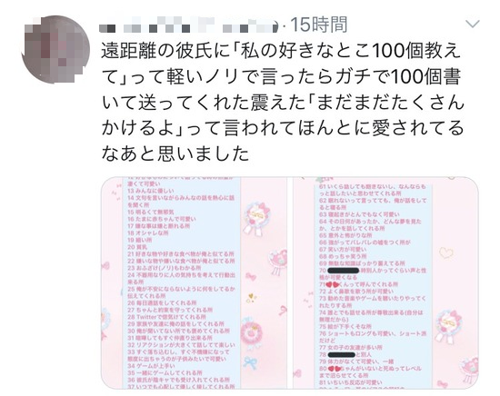 【感動】女の子「彼氏にLINEで私の好きなところ100個教えてって言ったらほんとに送ってきた」