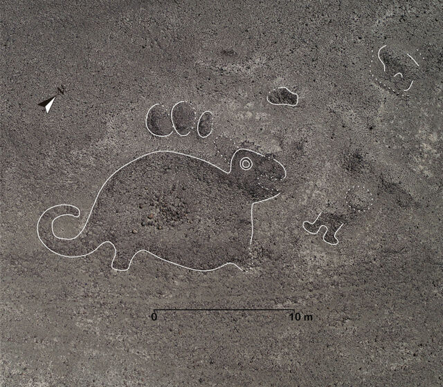 同大人文学部の坂井正人教授(文化人類学・アンデス考古学)らの研究グループが2016~18年、ナスカ台地の高解像度画像の分析と現地調査を行った。台地西部の小道に沿って地上絵が集中的に描かれたという仮説を立て、人のほか鳥やヘビといった動物の地上絵142点を発見した。