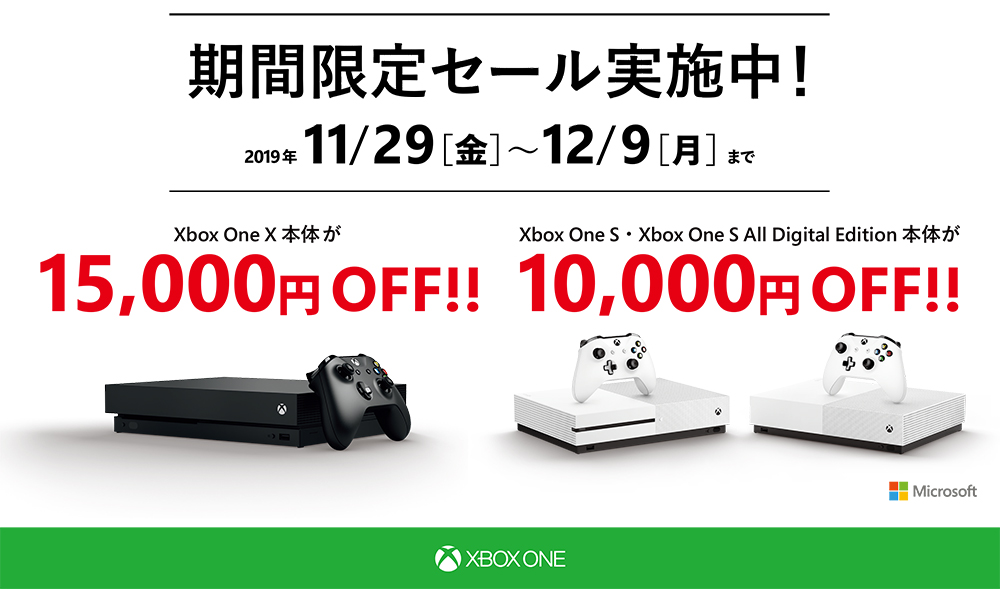 今回のセールでは期間中Xbox One Xが15,000円、Xbox One S及びXbox One S All Digital Editionが10,000円割引されることによりXbox One Xが約40,000円(税込)、Xbox One Sが約18,000円(税込)で購入することができる。