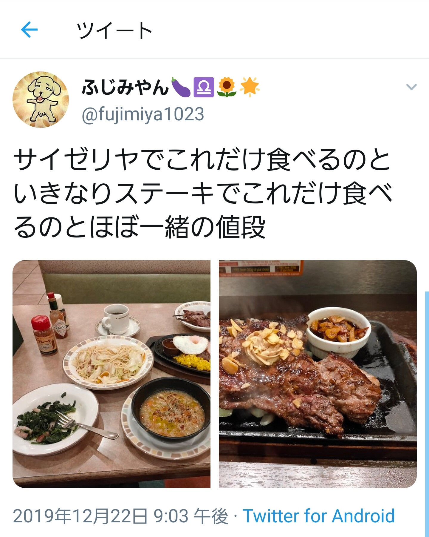 ホーム > その他 > ツイッター「サイゼリヤはいきなりステーキと同じ値段でこれだけ食えます」 2019/12/26 ツイッター「サイゼリヤはいきなりステーキと同じ値段でこれだけ食えます」 1: 風吹けば名無し 2019/12/24(火) 12:17:01.66 ID:G7Zg/Irv0EVE サイゼリヤでいいな 続きを読む - その他