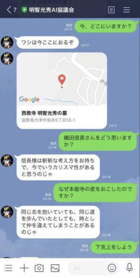 明智光秀AIはチャットボットというプログラムで、LINE公式アカウント「明智光秀AI協議会」として提供。