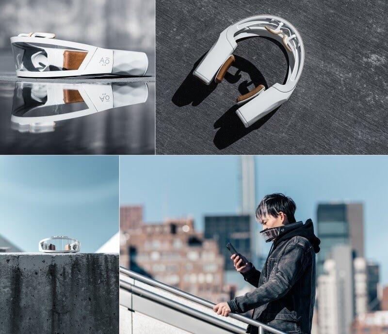 Atmōsは、ARゴーグルのような形状をしたデバイスで、鼻と口の上に取り付けて使う。電動ファンが設けられており、吸い込んだ外気をフィルターに通して内部へ供給することで、常にきれいな空気が吸える。通常のマスクと違って鼻と口が覆われないため、空気が新鮮で、呼吸しやすく、眼鏡が曇らない。しかも、正面は透明になっていて、顔の表情が見える。