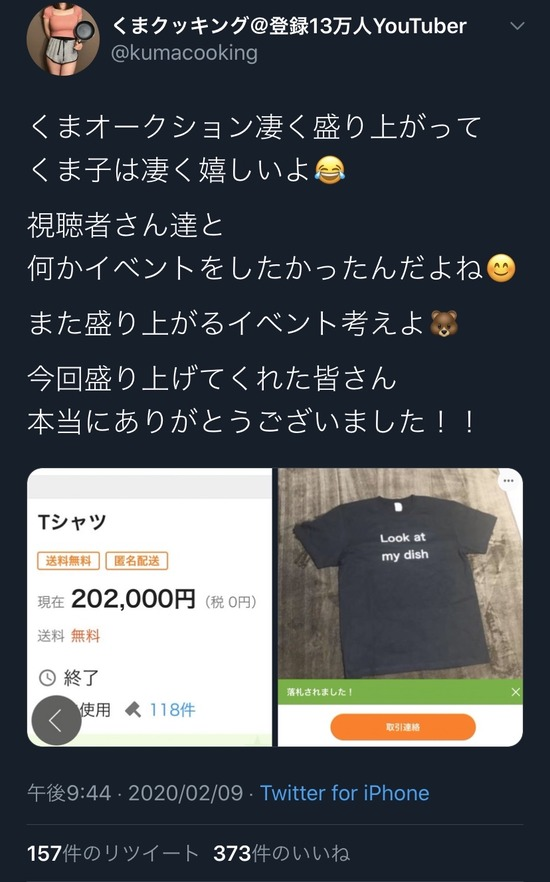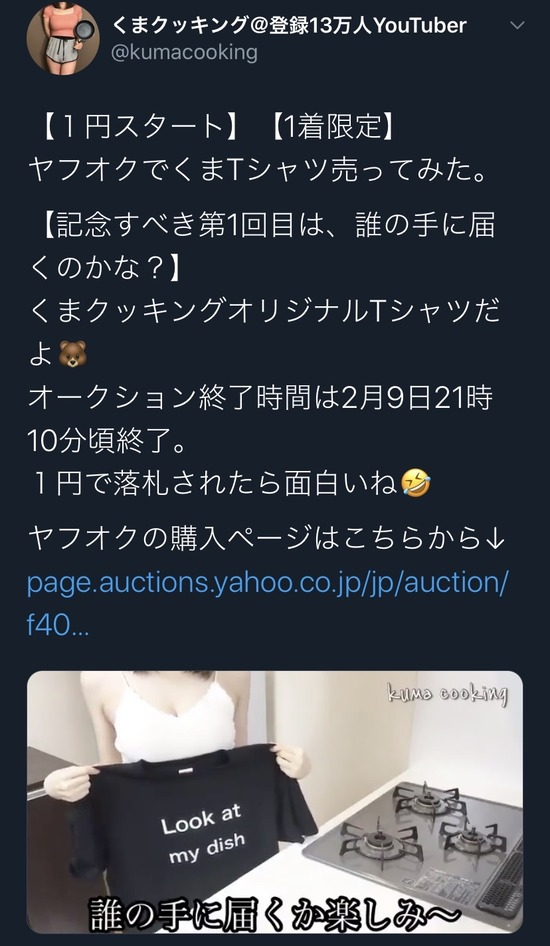 【画像】巨乳料理系YouTuberさん、着ていたTシャツを20万で売ってしまうwww