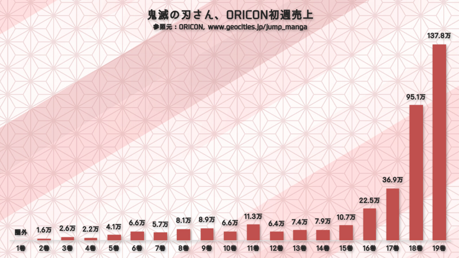 ホーム > アニメ・漫画 > 鬼滅の刃の初週販売数をグラフで示した画像、マジで怖すぎるWWWW 2020/02/14 1: 風吹けば名無し 2020/02/14(金) 10:22:38.83 ID:9MrBIgydMSt.V 1巻 初動圏外 19巻 初動137.8万部 続きを読む - アニメ・漫画