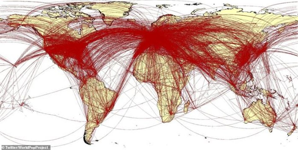サウサンプトン大学の研究者によって作成された地図は、流行の始まりから都市が完全に閉鎖される前に武漢から旅行した合計500万人のうち6万人が世界を横断したことを示しています。