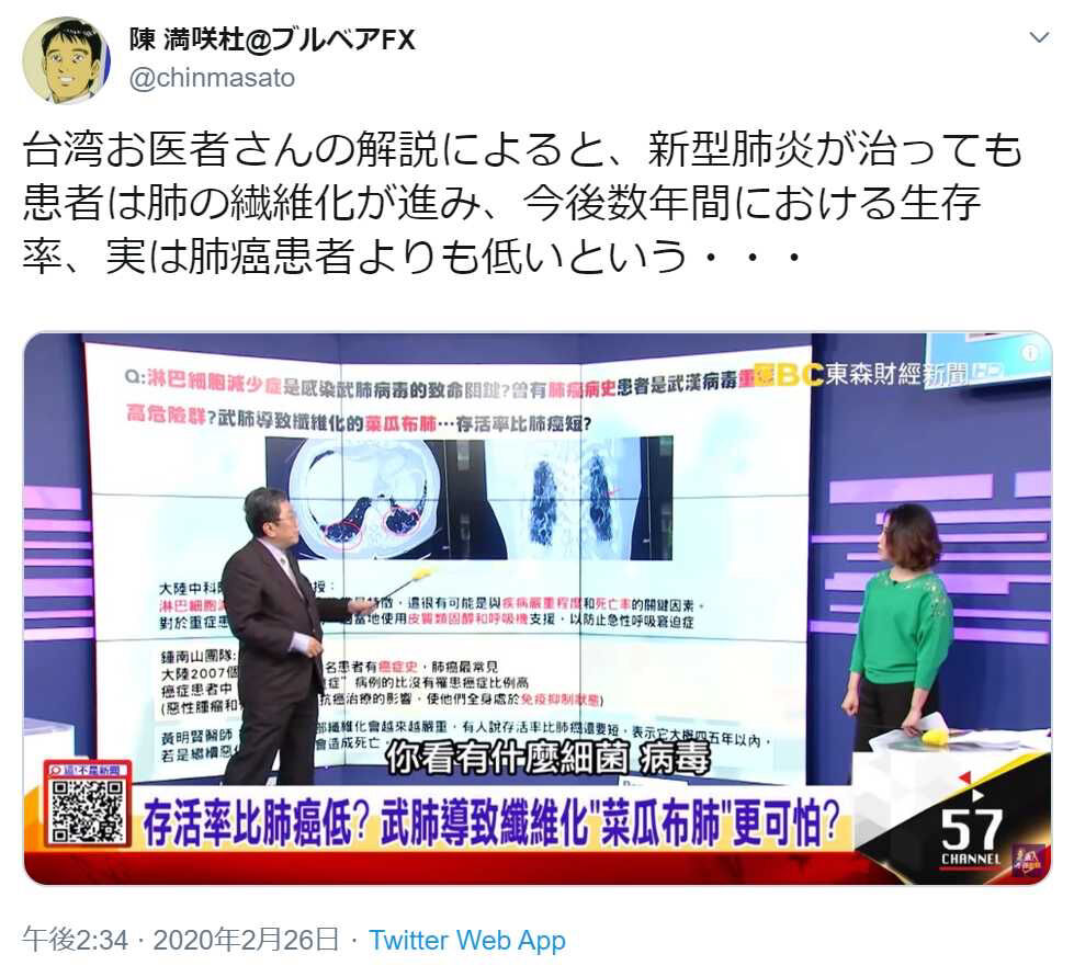 ホーム > 海外ニュース > 台湾医者「新型肺炎は治っても数年で死ぬ。肺ガンよりも死ぬ。」に対する5chネラーの見解 2020/02/27 1: (光) [EU] 2020/02/27(木) 19:18:41.25 ● BE:828293379-PLT(13345) 続きを読む - 海外ニュース