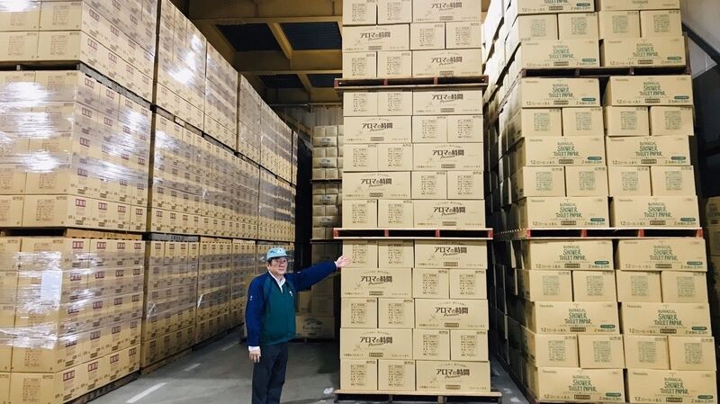 倉庫に積まれた大量のトイレットペーパー入り段ボールの写真も掲載。