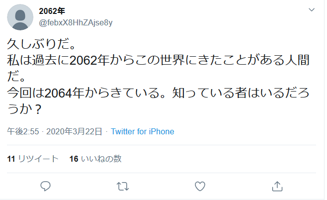 ホーム > オカルト > Twitterに2062年未来人が現れたんだが 2020/03/26 1: 本当にあった怖い名無し 2020/03/22(日) 15:23:23.83 ID:U0jjdqeE0 @febxX8HhZAjse8y https://twitter.com/febxX8HhZAjse8y これ本物か? 続きを読む - オカルト