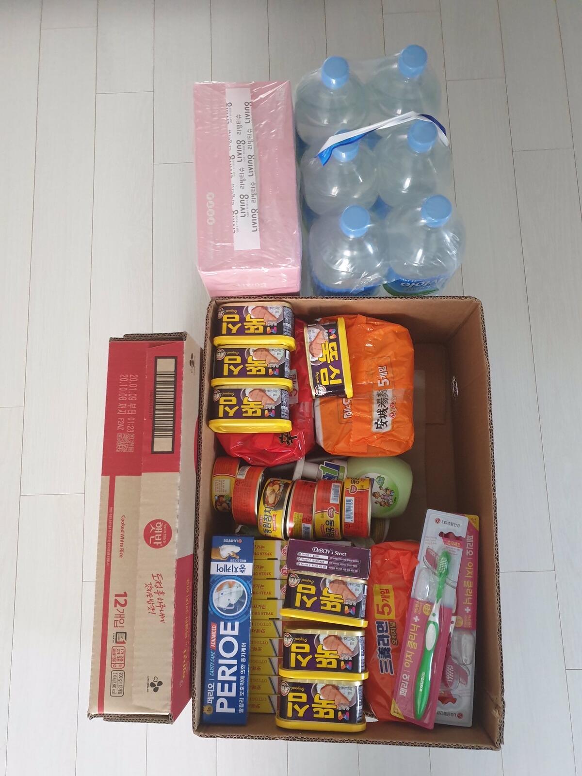 지인이 확진자 접촉자인데(검사했고 음성) 최종 접촉 후 2주간 자가격리라 동사무소에서 문앞에 놓고 갔다는 꾸러미. 꽤 실하다. 라면, 햄, 햇반, 3분 카레, 손세정제, 생수, 휴지, 칫솔, 치약, 손소독제, 마스크 pic.twitter.com/ghYLPpyr6d