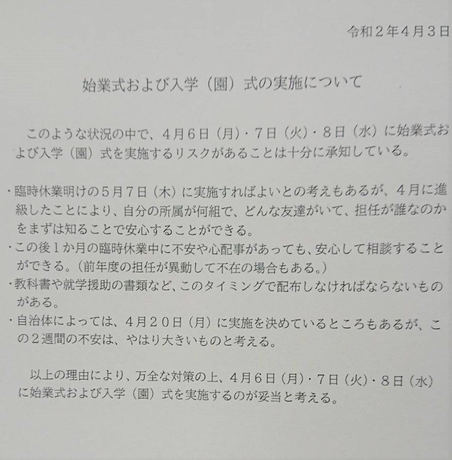 このような状況の中で、4月6日(月)・7日(火)・8日(水)に始業式および入学(園)式を実施するリスクがあることは十分に承知している。