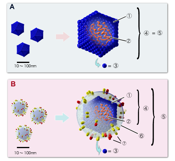 (A)表層膜(エンベロープ)を持たないウイルス (B)表層膜を持つウイルス/Credit:Y_tambe