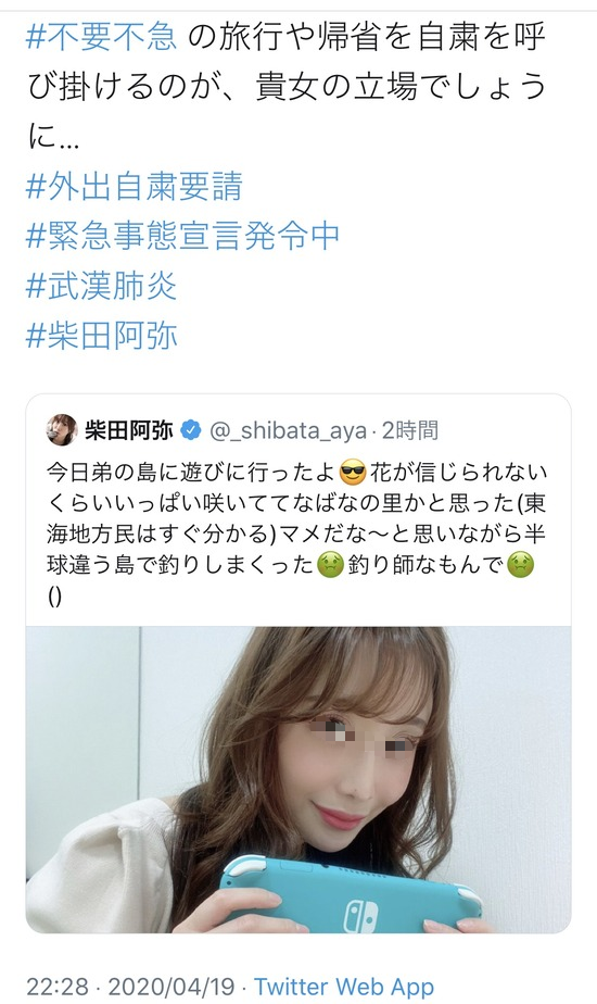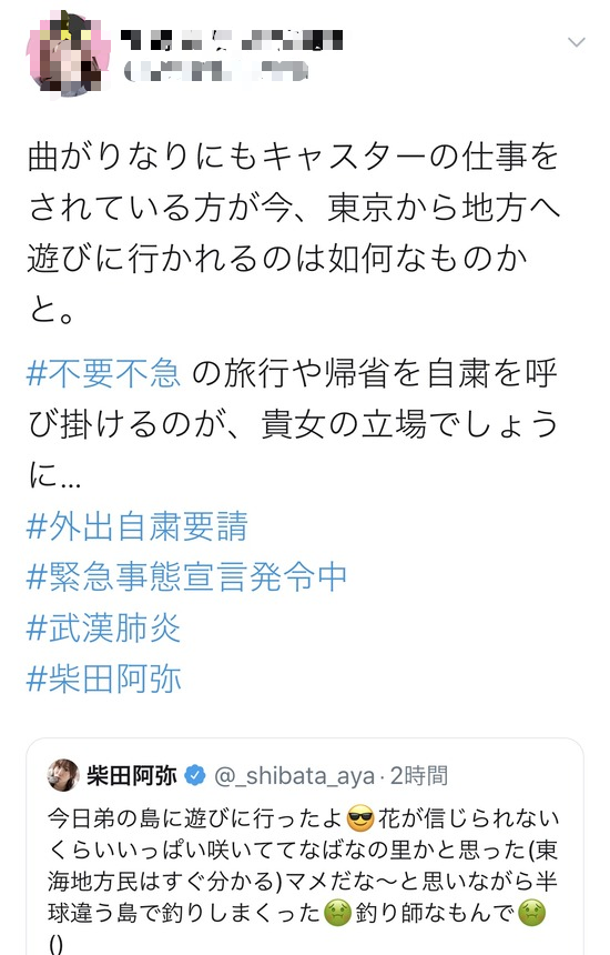 【画像】女子アナ「弟の島に行ったよ♪」ツイカス「外出するな!」→結果www