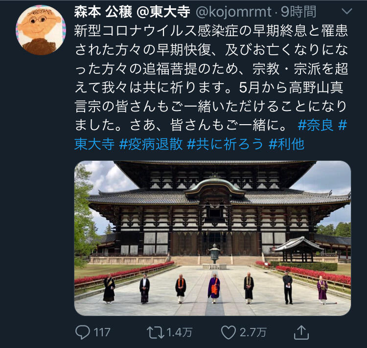新型コロナウイルス感染症の早期終息と罹患された方々の早期快復、及びお亡くなりになった方々の追福菩提のため、宗教・宗派を超えて我々は共に祈ります。5月から高野山真言宗の皆さんもご一緒いただけることになりました。さあ、皆さんもご一緒に。 #奈良 #東大寺 #疫病退散 #共に祈ろう #利他 pic.twitter.com/LQPAumJpaE