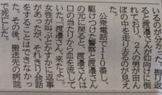 男たちに捕まった。渡邉さんは、最後まで女性を守りながら殺された。
